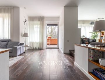 La zona giorno si apre su un ampio soggiorno con camino e sala da pranzo, ambienti accoglienti e luminosi che si affacciano su un grande terrazzo esposto a sud con vista sul giardino condominiale, ideale per momenti di relax o per ricevere ospiti.