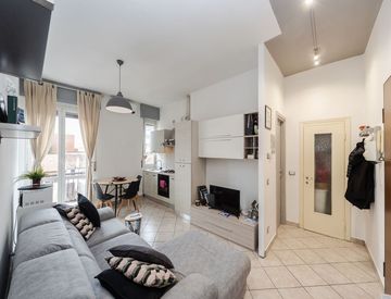 L'appartamento si apre su un soggiorno open space molto luminoso grazie alle ampie finestre con accesso diretto al balcone privato che regala una vista aperta sui tetti della città. La cucina a vista è dotata di arredi chiari contemporanei ed elettrodomestici recenti: ideale per chi ama vivere la casa ogni giorno o ricevere amici.