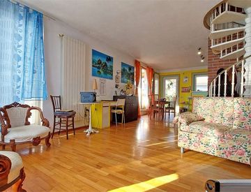 Questa soluzione abitativa si sviluppa su due livelli, offrendo spazi ben distribuiti e un'atmosfera accogliente. La zona giorno si distingue per la sua luminosità, impreziosita dalla presenza di un camino che la rende calda e confortevole, mentre la cucina a vista aggiunge un tocco di convivialità all'ambiente.