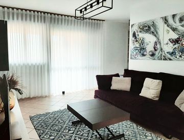 Il soggiorno, luminoso e spazioso, si affaccia sul secondo terrazzo, creando un ambiente perfetto per momenti di relax. La zona notte è separata da una porta, garantendo privacy e tranquillità. Le camere da letto sono dotate di un elegante balcone alla francese, mentre i due bagni offrono praticità: uno con vasca e finestra, l'altro cieco con box doccia.
