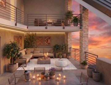 Composto al primo livello da ingresso, soggiorno con cucina a vista che si affaccia su grande terrazzo, disimpegno e bagno con balcone; al secondo livello interamente abitabile, tre camere, due bagni, terrazzo e balcone.
