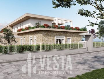 La soluzione è così composta: tramite ingresso accediamo alla zona giorno, ampio soggiorno con vetrate scorrevoli con cucina a vista ed uscita su portico con pergolato e giardino privato sudisposto su tre lati, vivibile per momenti di relax pranzi/cene all'aperto o momenti di convivialità, tramite disimpegno passiamo alla zona notte dove abbiamo una camera matrimoniale con bagno privato, due camere ed un bagno completo di doccia.