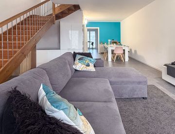 L'appartamento è disposto su due livelli, sito a piano primo e composto da: ingresso, soggiorno con ampio terrazzo, cucina abitabile e bagno. Tramite scala interna si accede a piano sottotetto dove troviamo due camere di cui una con balcone panoramico e il bagno. Incuso nel prezzo anche due spaziosi posti auto coperti. L'appartamento si trova in perfette condizioni pronto da abitare.