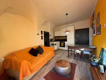 L’ingresso conduce alla zona giorno, composta da cucina attrezzata e soggiorno arredato con divano e tavolo da pranzo, ambiente luminoso e funzionale, ideale per la vita quotidiana.