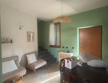 Al piano terra: l’ingresso avviene nel salotto completamente arredato con cucina a vista. Dall’ambiente cucina, tramite porta finestra si accede al piccolo terrazzo adatto per pranzare all’aperto. Presenza di un disimpegno, dotato di lavatrice, che conduce al bagno finestrato con doccia.