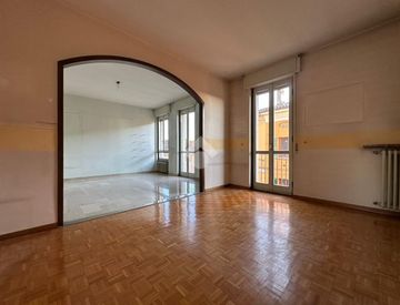 L'appartamento, di 120 mq, si trova al secondo piano della palazzina. L'ingresso si apre sulla zona giorno, composta da ampio soggiorno e cucina abitabile. Il disimpegno serve poi la zona notte, suddivisa in due camere da letto, ripostiglio e due bagni, dotati entrambi di vasca. La metratura del soggiorno fa sì che si possa suddividere e creare una terza camera da letto, trasformando l'appartamento in un quadrilocale.