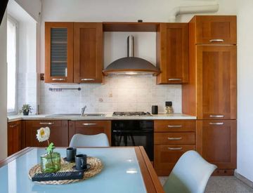 - Soggiorno con cucina a vista: tavolo da pranzo estendibile (fino a 8 persone), divano letto matrimoniale, TV 40".