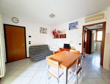 Si compone di ingresso in soggiorno con cucina a vista e terrazzino, disimpegno, camera da letto con terrazzo e bagno.