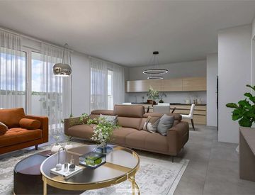 Ampia zona giorno: un luminoso living con accesso diretto al terrazzo di 27 mq, che abbraccia la casa e regala una splendida vivibilità esterna.