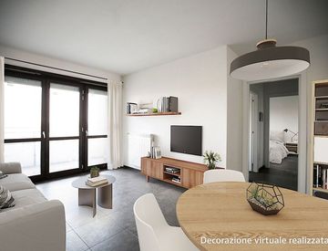 Panoramico bilocale di 67 mq interni composto da ampio soggiorno, cucina abitabile, camera da letto matrimoniale, servizi e balcone di 17 mq.