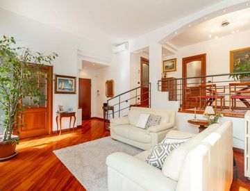 Le prestazioni e le finiture che caratterizzano questa abitazione sono di altissima qualità: parquet massello, un bagno in vetro di Boemia rosso amaranto, tapparelle elettriche, aria condizionata, tenda parasole telecomandata con chiusura automatica in caso di vento, predisposizione impianto d'allarme e illuminazione del giardino, basculante del box telecomandata.