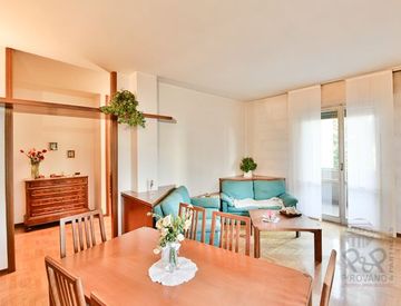 Le due camere matrimoniali, di cui una con balcone, offrono spazio sufficiente per tutta la famiglia. I due bagni, uno dei quali con lavanderia annessa, garantiscono funzionalità e comodità. Sebbene l'appartamento sia in discrete condizioni, necessita di alcuni interventi manutentivi o una revisione estetica per esprimere al meglio il suo potenziale.