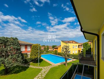 All'interno di un residence con piscina e giardino perfettamente curato, a pochi passi dal lago, proponiamo appartamento ristrutturato nel 2023 con travi a vista e soppalco.