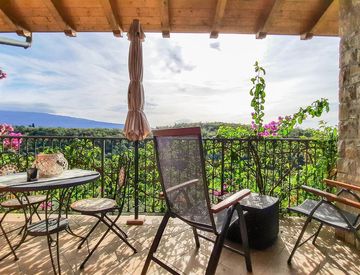 Dalla zona giorno si accede direttamente alla grande loggia coperta dove è possibile rilassarsi guardando il verde dei campi da golf oppure un bellissimo scorcio di lago.