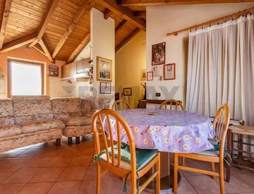 L’appartamento, mansardato con travi a vista, è composto da ingresso su soggiorno con cucina a vista, camera matrimoniale, camera singola e bagno con doccia.