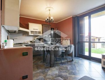 Ingresso su soggiorno con cucina a vista e accesso al giardino, disimpegno, bagno, due camere da letto e scala interna che porta all' ampia taverna, al secondo bagno e all' accesso diretto al box di proprietà.