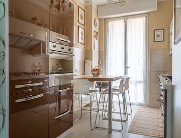Caratteristiche da segnalare: comodi armadi a muro presenti nel disimpegno e porta scorrevole in vetro con dettagli particolari in cucina, utile per separare gli ambienti mantenendone la luminosità. Accessoriata di climatizzatore, tende da sole.