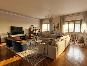 Per ispirare il tuo progetto di casa, abbiamo realizzato un render che mostra come l’ampio salone possa trasformarsi in un ambiente living dal perfetto equilibrio classico-moderno: uno spazio di design, luminoso e funzionale, pensato per le esigenze di una famiglia giovane che cerca comfort e stile per sé e per i propri figli.