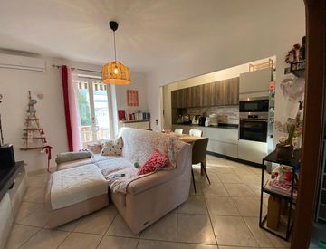 L'ingresso su disimpegno conduce a sinistra alla zona giorno composta da salotto e cucina semi abitabile, arredata su misura con possibilità di acquistarla, e ingresso sul primo balcone fronte strada.