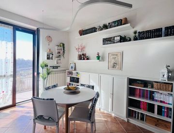 L'appartamento dispone di zona giorno con angolo cottura a vista, con balcone con affaccio a sud e vista mozzafiato sui colli canavesani, oltre al disimpegno, al bagno e alla camera da letto.