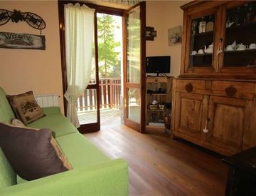 La camera da letto è spaziosa e può ospitare fino a tre persone, mentre il servizio con doccia è pratico e funzionale. I pavimenti in parquet aggiungono un tocco di eleganza all'ambiente. Non perdere l'occasione di godere del grande terrazzo, perfetto per le serate estive. L'appartamento è dotato di lavatrice e include anche una cantina per riporre comodamente le attrezzature sportive.
