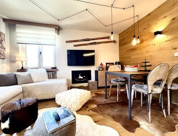 Il soggiorno offre un accesso diretto a un terrazzo privato, da cui si può godere di una vista mozzafiato sulle piste da sci in inverno e sui verdi campi da golf in estate. La cucina a vista è completamente attrezzata con elettrodomestici moderni, perfetta per preparare deliziosi pasti dopo una giornata sulle piste.