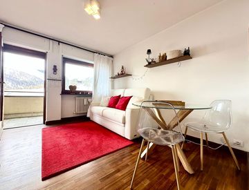 La vista panoramica e l'ottima esposizione a sud rendono questo spazio luminoso e invitante. Goditi il tuo caffè mattutino sul comodo balcone o approfitta della terrazza per momenti di relax all'aperto. Inoltre, la proprietà include un posto auto coperto in autorimessa e uno ski-box, ideali per riporre l'attrezzatura da sci.