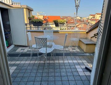 Via Valeggio, splendida mansarda con terrazzo, open space, totalmente arredata e accessoriata, Mq 120. Ingresso su salone con angolo studio, cucina, camera e bagno.