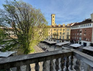 In stabile d'epoca, signorile, sito al 2° piano con ascensore, scale affrescate, disponibile da inizio aprile, alloggio angolare, con affaccio sulla Piazza IV Marzo, luminoso, composto da ingresso su ampio soggiorno con cucina abitabile e salotto, camera da letto con cabina armadio e bagno, soppalco con zona studio e lavanderia.