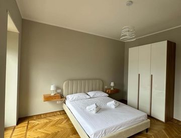 Appartamento ristrutturato situato a 5 minuti a piedi da Piazza Castello, completo di letti, scrivania, sedie, luci e armadio. Cucina in comune attrezzata con pentole, piatti, bicchieri, posate, forno, piano cottura a induzione. Bagno con doccia e lavatrice in comune. Ampia zona giorno per 3-6 persone completa di tavoli e sedie. Riscaldamento centralizzato, servizio di portineria 8.30-12.30 / 14.30-18.30.