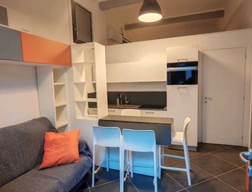 Appartamento composto da ingresso living su cucina, disimpegno con servizio dotato di doccia, e camera da letto con zona armadiate, scrivania e letto soppalcato.
