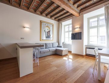 L’immobile si distingue per un luminoso soggiorno con cucina a vista, impreziosito da uno splendido soffitto a cassettoni, due camere da letto entrambe con balcone e affaccio sulla raffinata corte interna, e doppi servizi moderni.