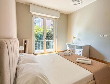 Renovated apartment located in San Donato area, complete with beds, desk, chairs, lights and closet. Shared kitchen equipped with pots, dishes, glasses, cutlery, oven, induction cooktop. Shared bathroom with shower and washing machine. Large living area for 3-6 people complete with tables and chairs.