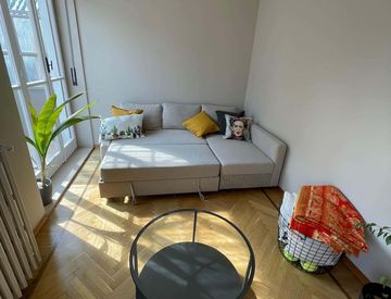 Renovated apartment, complete with beds, desk, chairs, lights and wardrobe. Shared kitchen equipped with pots, plates, glasses, cutlery, oven, induction hob. Bathroom with shared shower and washing machine. Large living area for 2 people complete with tables and chairs. Central heating, Bills end weekly cleaning service included.