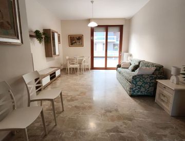 Ampio bilocale al primo piano arredato, con affaccio su un grande terrazzo da 40 mq e grande balcone, cucina, bagno, soggiorno e camera, con cantina mq. 6 e box mq. 16