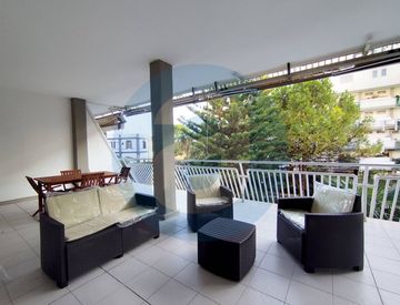 ESTERNO: Appartamento al secondo piano in uno stabile di sette piani, dotato di ascensore. Balcone terrazzato di 55 mq con esposizione a sud e dotato di tende da sole. Balcone di 18 mq, dotato di lavabo. Posto auto coperto a piano interrato. Campo da tennis a uso condominiale. Servizio di portineria.