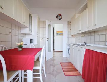 L'appartamento dispone di una cucina abitabile, 2 camere di cui una doppia e una singola, 1 bagno ed un ampio balcone che ospita un tavolino con delle sedie.