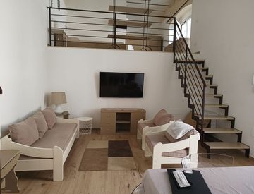 Camera da letto soppalcata, completamente arredata, seconda camera uso studio, vano con elettrodomestici, lavatrice e asciugatrice.