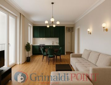 Open space fulcro dell’appartamento, con soggiorno, cucina a vista con sola centrale e balconcino.