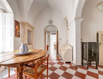 La casa conserva intatto il fascino dell’antico, con pavimenti in cementine decorate, particolari in pietra grezza e dettagli architettonici d’epoca.