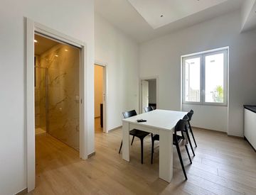 Questo appartamento offre un'elegante e lussuosa esperienza abitativa. L'ingresso conduce a un ambiente unico che ospita l'angolo cottura e la zona living, caratterizzata da una piacevole luminosità e da finiture di altissima qualità, che conferiscono un'atmosfera accogliente e sofisticata.