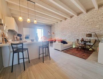 Questo appartamento unico vanta travi in legno a vista originali e muri in pietra che raccontano la storia dell'edificio, creando un'atmosfera calda e autentica. L'illuminazione, attentamente progettata per esaltare ogni dettaglio, contribuisce a definire un ambiente elegante e sofisticato, perfetto per chi cerca un'abitazione di prestigio.