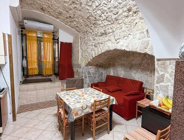 Zona giorno luminosa e accogliente, con soggiorno e cucina a vista, impreziosita da caratteristiche volte a botte e muro in pietra.
