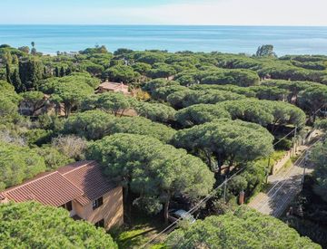Dal cancelletto d'ingresso ci accoglie il giardino esclusivo della villa. Lateralmente una tipica scala in muratura ci accompagna al piano superiore caratterizzato ad un'ampio soggiorno con caminetto e zona cottura. semiabitabile. Dal soggiorno possiamo fruire di un'ampia balconata panoramica sulla pineta e giardino. Nella zona notte troviamo due spaziose camere da letto matrimoniali, bagno finestrato, e piccolo studiolo.