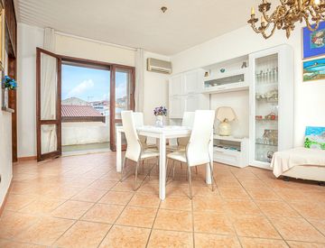 Trilocale - Zona giorno: spazioso salotto/sala da pranzo, cucinino con finestra, balcone vivibile con vista gradevole verso la piazza da un lato e sui tetti delle case del centro di Santa Teresa Gallura dall'altro.