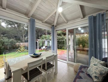 La villetta bifamiliare offre ampi spazi esterni, con un giardino curato dotato di zone prendisole e aree per conversazioni all'aperto. L'ingresso avviene tramite un vialetto comune, conducendo a un luminoso soggiorno-cucina con una veranda chiusa, perfetta per godere della vista sul giardino. La camera da letto ha accesso diretto all'esterno, creando un collegamento armonioso tra gli spazi interni ed esterni.