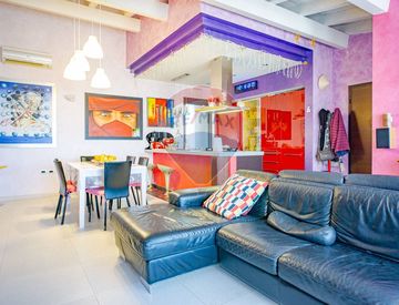 L'appartamento si trova al quarto ed ultimo piano servito da ascensore privato in una palazzina priva di spese condominiali ed è così distribuito: ingresso su grande open space, due camerette, una camera da letto, due bagni di cui uno con vasca ed uno con doccia. Completa l'immobile un terrazzino in zona living di 14 mq con vista panoramica.