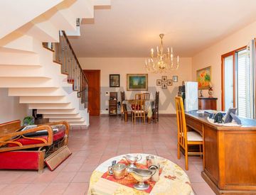 Dalla bellissima e scenografica scala a giorno si accede al piano superiore, mansardato, dove accediamo in open space al grande salotto, servito da balcone, segue un' ampia zona living, che affaccia su terrazzo a livello, dove si possono trascorrere piacevoli momenti godendo di una bellissima vista.