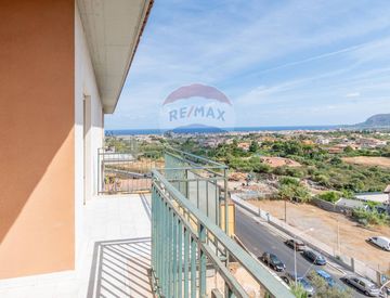 ingresso su ampio salone con balcone vista mare, cucina abitabile con ulteriore balcone, disimpegno, tre camere da letto, doppi servizi: uno con vasca e uno con doccia.