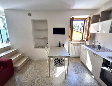 - luminosa cucina con caminetto e balcone;